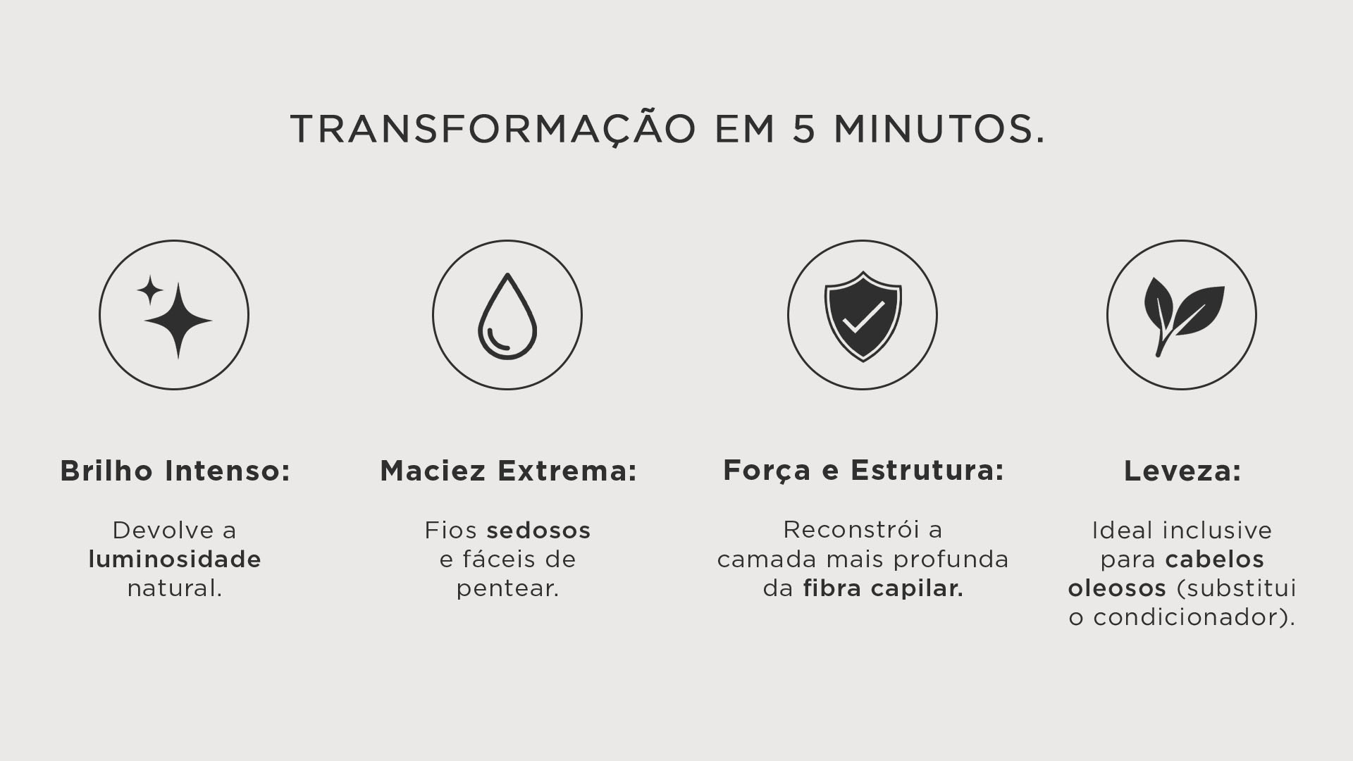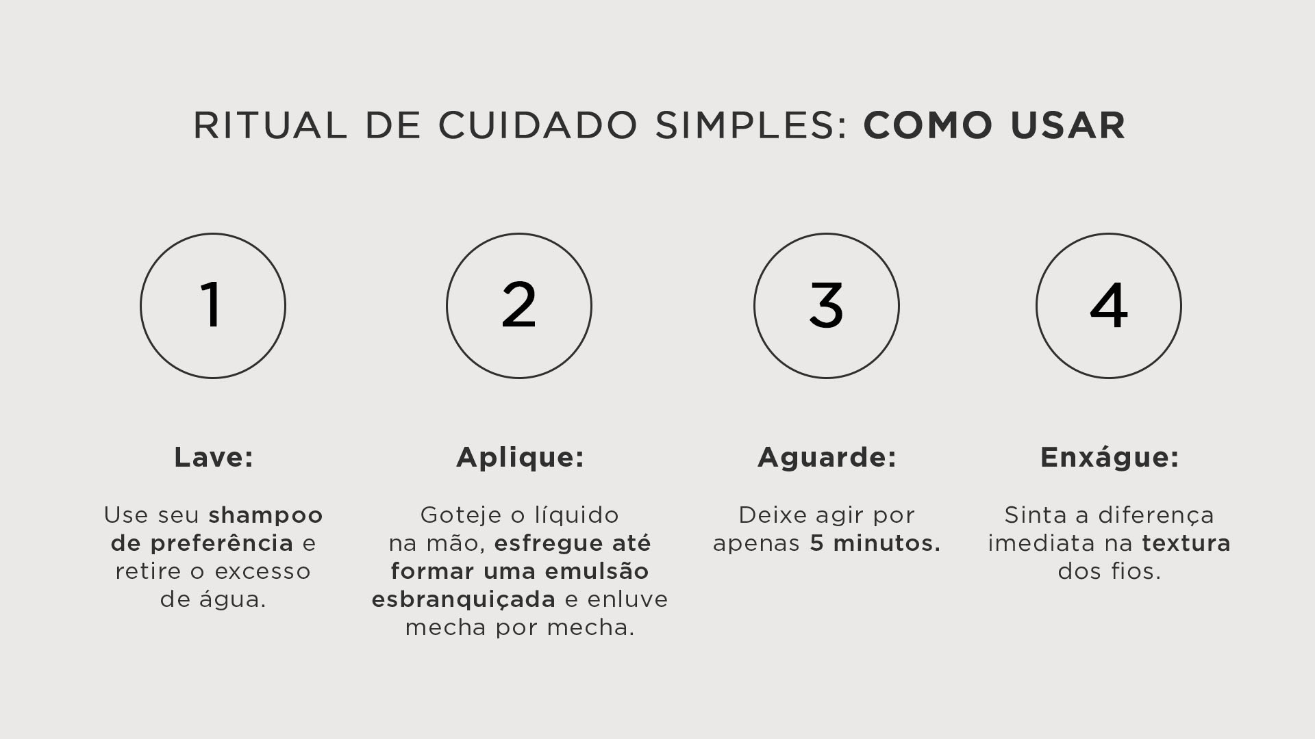 Após a aplicação nos cabelos limpos e úmidos, deixe agir por 5 minutos e enxágue.